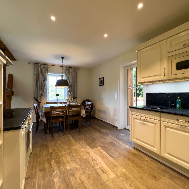 - Küche mit großem Essbereich, komplett ausgestattet mit Kühlschrank, Induktionskochfeld, E-Herd, Geschirrspüler, Mikrowellenherd mit Grill, Kaffeemaschine, Wasserkocher, Toaster, Geschirr, Besteck